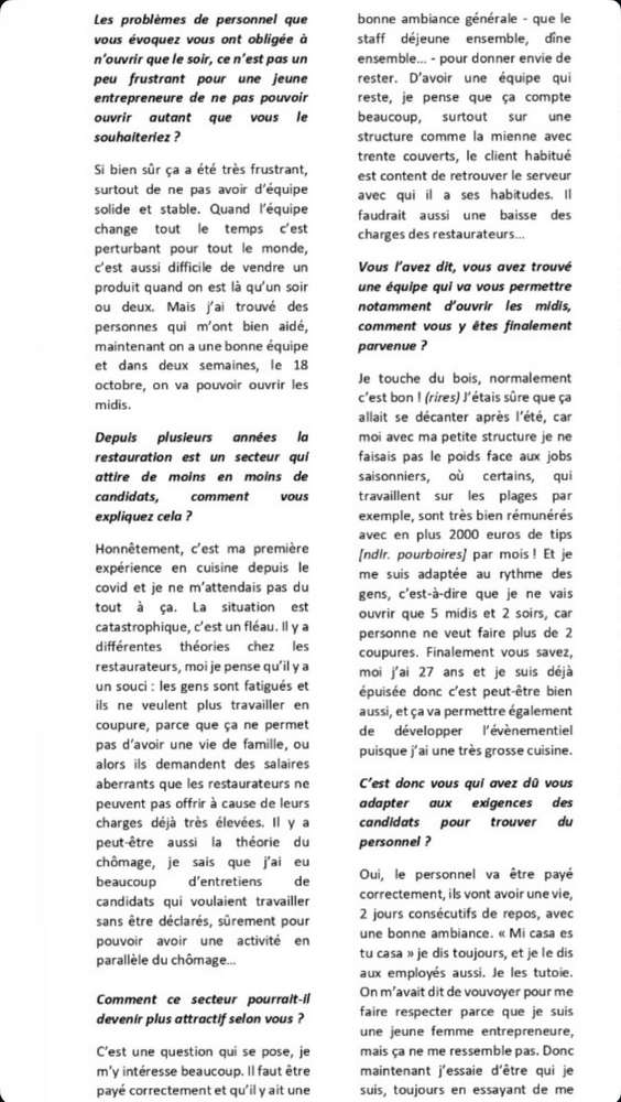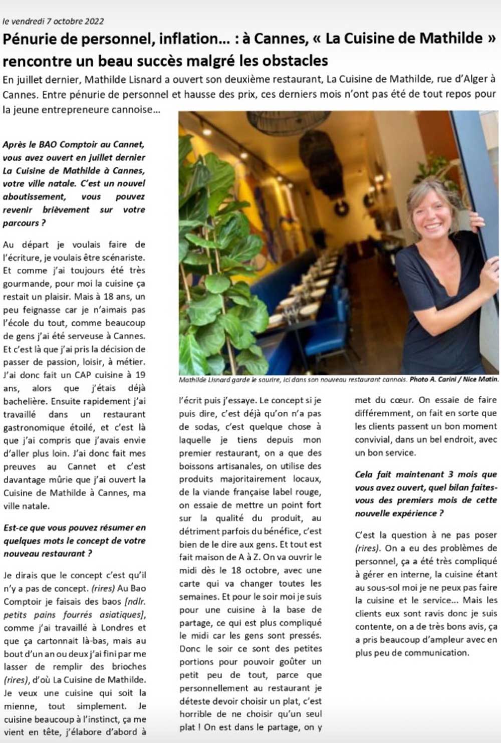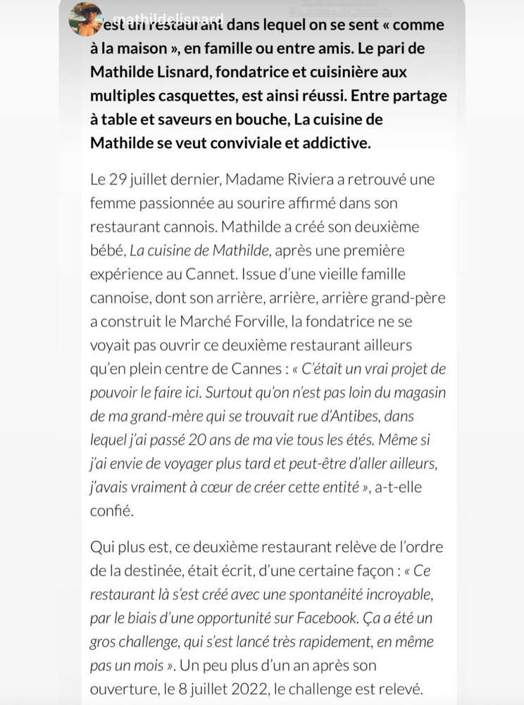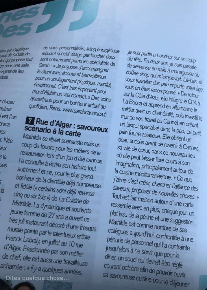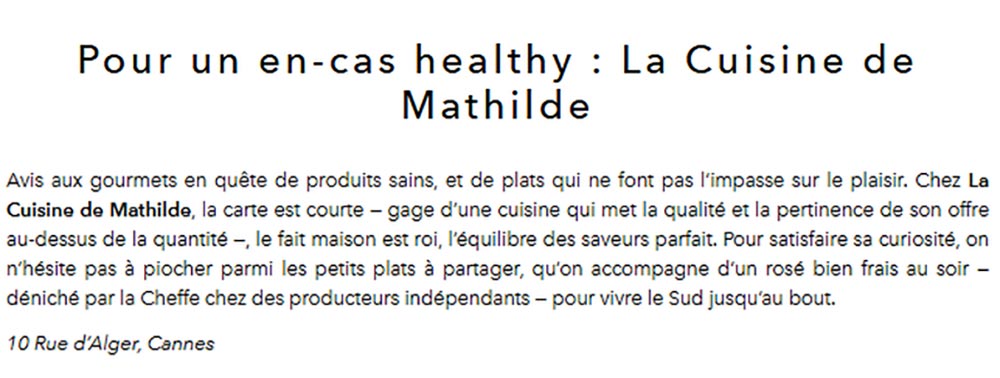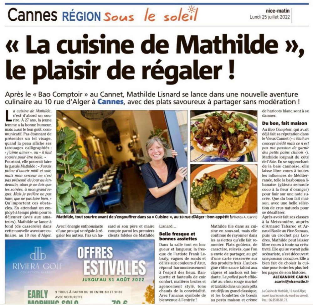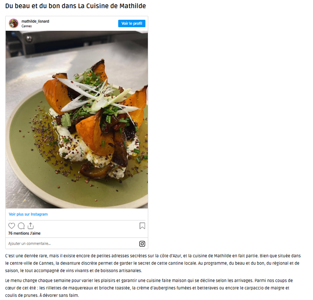 EXCELLENT Basée sur 103 avis Publié sur elena petrea2024-06-15Trustindex vérifie que la source originale de l'avis est Google. Voilà ce que j’appelle un moment parfait. Nous avons passés une agréable soirée dans cet endroit à l’ambiance très cosy. L’accueil de Benjamin a été des plus convivial et le concept de cuisine-partage particulièrement intéressant. Nous avons pu découvrir des saveurs auxquelles nous ne somme pas habitués. Pourtant, ces plats simples étaient plus que délicieux. Adresse à ne pas manquer !Publié sur Elisabetta Fox Piantoni - Foxsbackpack2024-06-09Trustindex vérifie que la source originale de l'avis est Google. The food options aren’t that many which allows the menu to be always fresh and selective which we really appreciated. Everything was delicious and the service was attentive and fast - highly recommend!Publié sur Sarah Todd2024-06-09Trustindex vérifie que la source originale de l'avis est Google. Highly recommend for lunch in Cannes. We chose from a simple 5 item menu where each dish was a work of art in presentation and flavours. Double check the hours of operation it may be more than the 2 hours advertisedPublié sur julie BOZA2024-06-08Trustindex vérifie que la source originale de l'avis est Google. À découvrir absolument ! avr. 2024 Pas de la Région, nous recherchions un restaurant qui sort de l'ordinaire. En étant au bord de mer et habituellement nous adorons les pique nique sur la plage. Cependant nous avions vraiment envie de nous faire plaisir et de bien manger les pieds sous la table. En nous promenant nous découvrons cette adresse (dans le centre ville donc très pratique). Le concept des mezzes a partager nous a plu. Etant accompagnés d'une ado (dont les gouts culinaires sont limités....) nous n'avons absolument pas été déçus, bien au contraire! Nous avons tout aimé ! Des découvertes de saveurs que l'on n'imaginait même pas. Des associations d'aliments et d'assaisonnements parfaits. On sent que les produits sont frais et de très bonne qualité. De plus, la personne qui nous a servi (un jeune homme très sympathique) nous a vraiment décrit tous les plats et les ingrédients en amont de notre commande et tout correspondait. Nous n'avons pas été poussé à la consommation, bien au contraire, il nous a parfaitement conseillé sur les proportions des plats et quantités par personne. La décoration est aussi très belle. Sans chichis et de très bon goût. Pour résumer, on sent une réelle passion pour la cuisine en passant par le service et de faire plaisir aux clients. Bref, nous recommandons sans hésiter cette adresse !Publié sur Suzanna Holmqvist2024-05-23Trustindex vérifie que la source originale de l'avis est Google. Love it!Publié sur Romain Bouge2024-05-10Trustindex vérifie que la source originale de l'avis est Google. La cuisine de Mathilde c'est le restaurant qui s'adresse aux gourmets à la recherche de produits sains. Les plats, sous leurs apparences de simplicité, cachent en réalité un vrai travail de fond où tous les ingrédients sont admirablement mis en valeur par le talent de la cheffe.Publié sur Sandrine Villetard2024-04-11Trustindex vérifie que la source originale de l'avis est Google. Incroyablement bon ! Une expérience de partage que je recommande.Publié sur Anastasia2024-04-08Trustindex vérifie que la source originale de l'avis est Google. Incredible place! The food is magnificent! Very delicious!! If I could I’ll give 10 stars) with pleasure will be back!